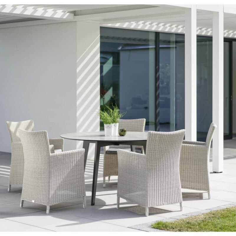 Der Tisch kann mit Gartenmöbeln aus unterschiedlichen Materialien kombiniert werden. Wer Metall liebt, kombiniert den Tisch ganz einfach mit Aluminium-Möbeln, Stühle aus Geflecht sind aber auch stilvolle Begleiter für den Gartentisch. Der Tisch bietet viele Möglichkeiten, sich eine individuelle Essgruppe zusammenzustellen.