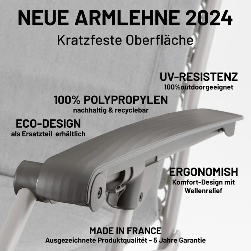 Die Armlehnen überzeugen mit einer kratzfesten Oberfläche und UV-resistentem Kunststoff. Hergestellt aus 100 % recycelbarem Polypropylen ist sie nicht nur nachhaltig, sondern auch ideal für den Outdoor-Einsatz geeignet. Ihr ergonomisches Design mit Wellenrelief garantiert höchsten Komfort.